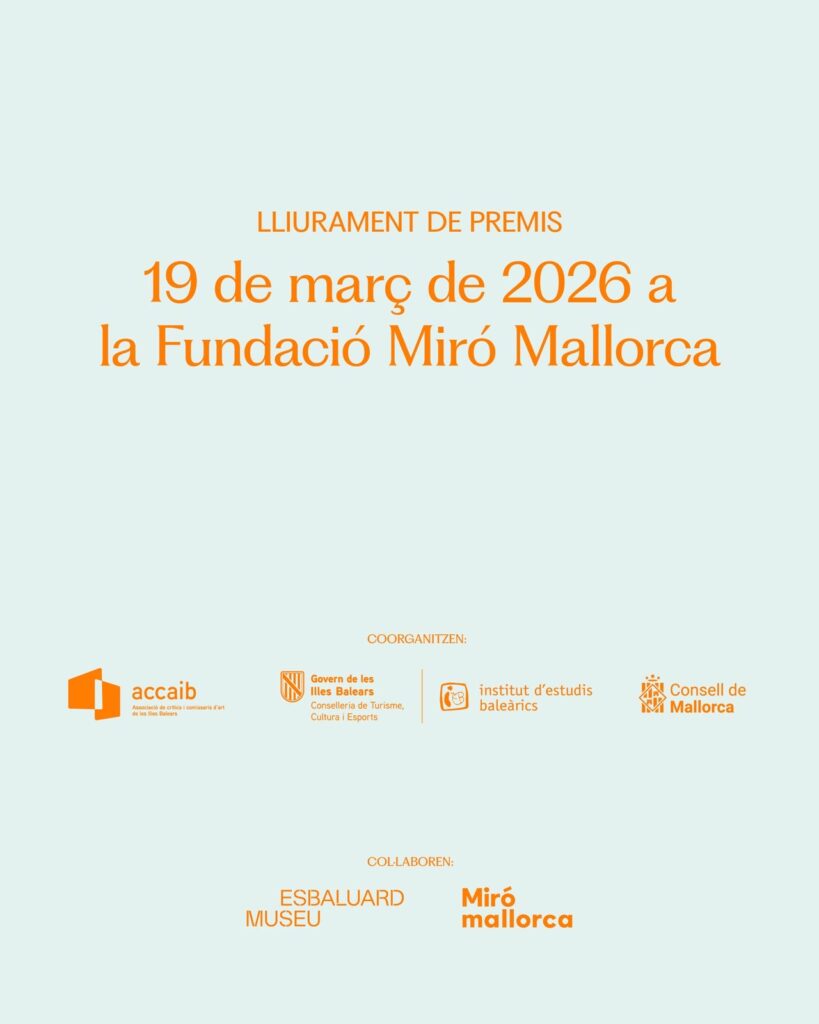 The ACCAIB Awards will hold their awards ceremony on 19 March at the Fundació Miró Mallorca. Promoted by the Association of Art Critics and Curators of the Balearic Islands, the awards recognise the work of art curators and critics and aim to reinforce the role of reflection and critical thinking within the visual arts sector in the Balearic Islands.