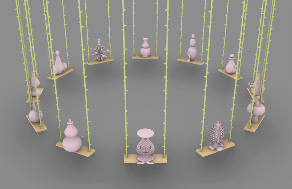 Grip Face s’inspira en notícies de bombardejos en parcs infantils a llocs com Gaza o Ucraïna, i fa servir el gronxador com a element simbòlic per subratllar la fragilitat de la infància en temps de guerra. Aquests columpis, immòbils i penjats d’espines, converteixen l’espai en un escenari inquietant, on la teatralitat esdevé metàfora del camp de batalla i on la quietud comunica una tensió latent.