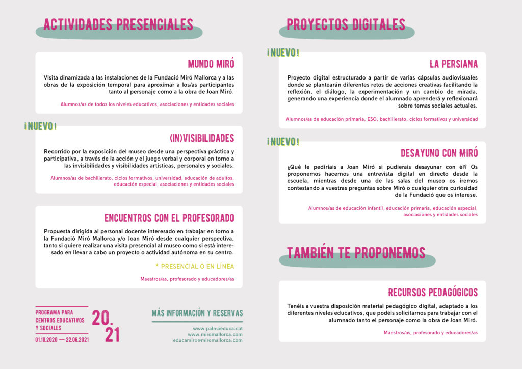 Desde el Departamento de Educación y Actividades de la Fundació Miró Mallorca os presentamos nuestro nuevo Programa para centros educativos y sociales para el curso 2020-2021