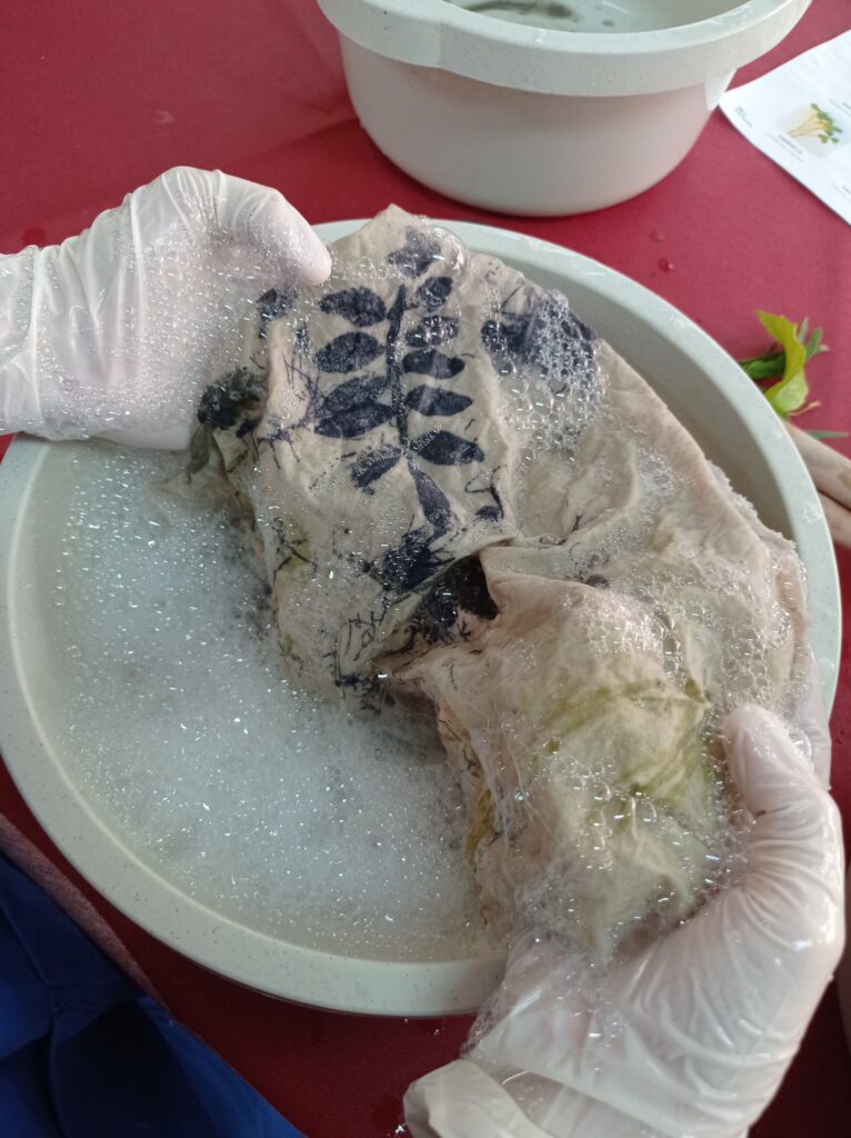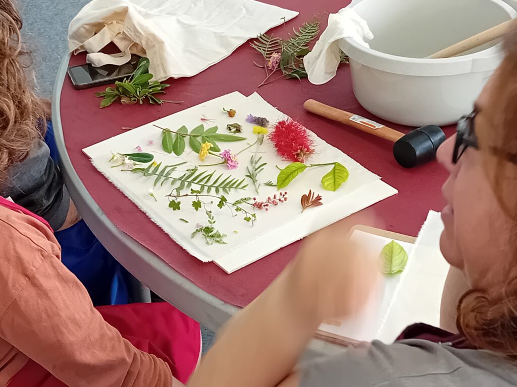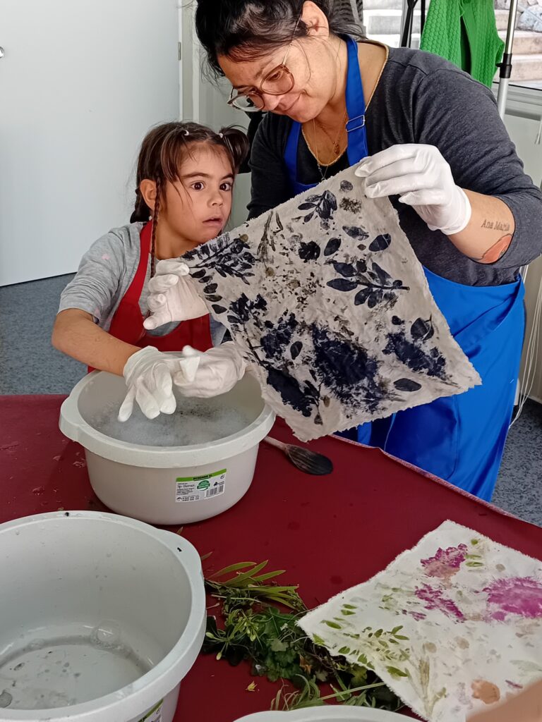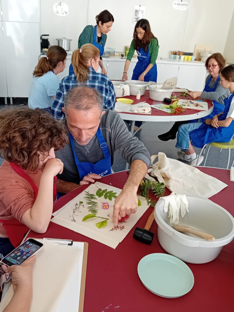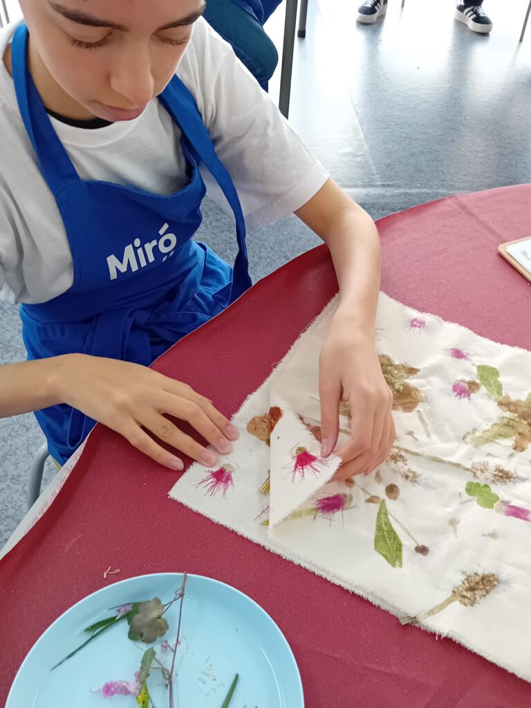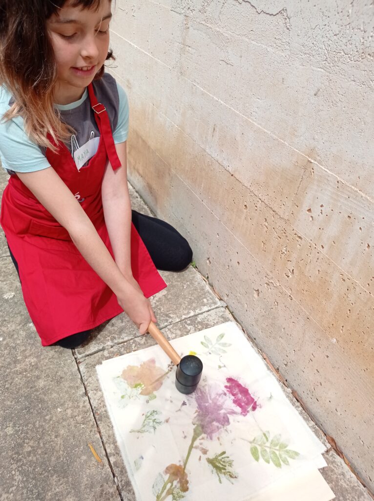 Seguidamente, nos hemos dirigido al Espacio Educativo, donde las familias han tenido una primera toma de contacto con todos los materiales y las herramientas necesarias para crear sus obras textiles mediante la técnica de estampación japonesa tataki zome. Poco a poco, hemos ido machacando las plantas recolectadas y, a ritmo de golpes de maza, un estallido de mil colores ha ido impregnando por completo nuestros tejidos. Después, hemos sometido nuestras creaciones a un proceso químico para conseguir la permanencia de los colores y, sorprendiéndonos, ¡han empezado a aparecer formas vegetales de azules y verdes inimaginables! Para terminar, hemos enmarcado nuestras coloridas obras botánicas sobre un bastidor de madera circular.