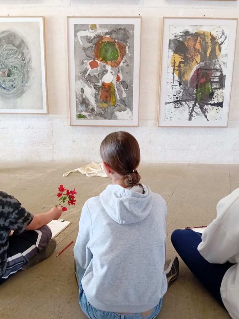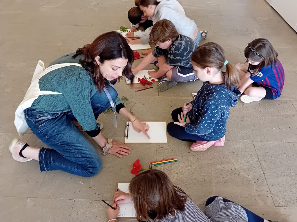 A lo largo de estas sesiones las familias participantes han visitado la exposición “Miró, 1983” y se han aproximado a algunas obras que Joan Miró realizó en Mallorca durante los últimos años de su vida: los monotipos y el libro de artista Tracé sur l’eau. Estas piezas nos han permitido, por un lado, conocer tanto el proceso creativo del artista como los elementos de la naturaleza que lo inspiraron; por otro, hacer una incursión en el mundo de las plantas. Entre otras cuestiones, hemos hablado sobre qué es un herbario, así como de la importancia de documentar gráficamente, dentro del ámbito de la ciencia, cualquier información relevante cuando se lleva a cabo un trabajo de campo. Para iniciarnos en el apasionante mundo de la ilustración botánica, hemos dibujado algunas de las plantas de los jardines de la Fundació y, posteriormente, las hemos coloreado a partir del cromatismo que hemos descubierto en las obras de Miró.