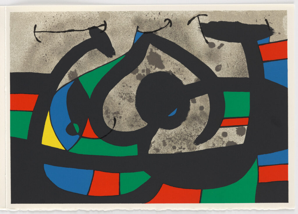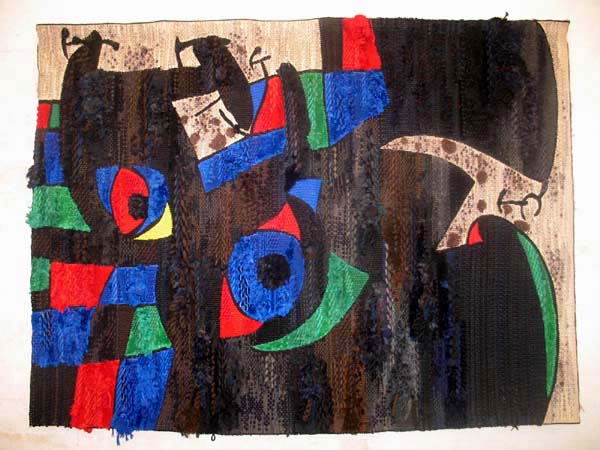 L’exposició inclou cinc tapissos on podem observar totes aquestes qualitats. Es tracta d’obres inspirades en el llibre de poemes de Le lézard aux plumes d’or, il·lustrat i escrit per Joan Miró a l’any 1971, del qual exhibim cinc litografies.