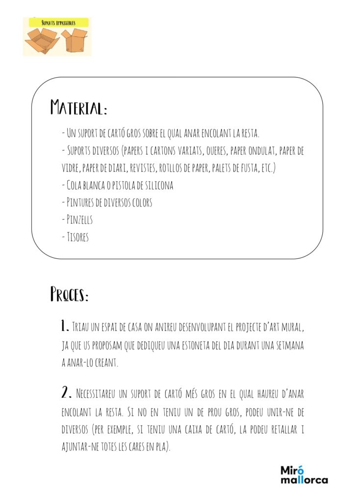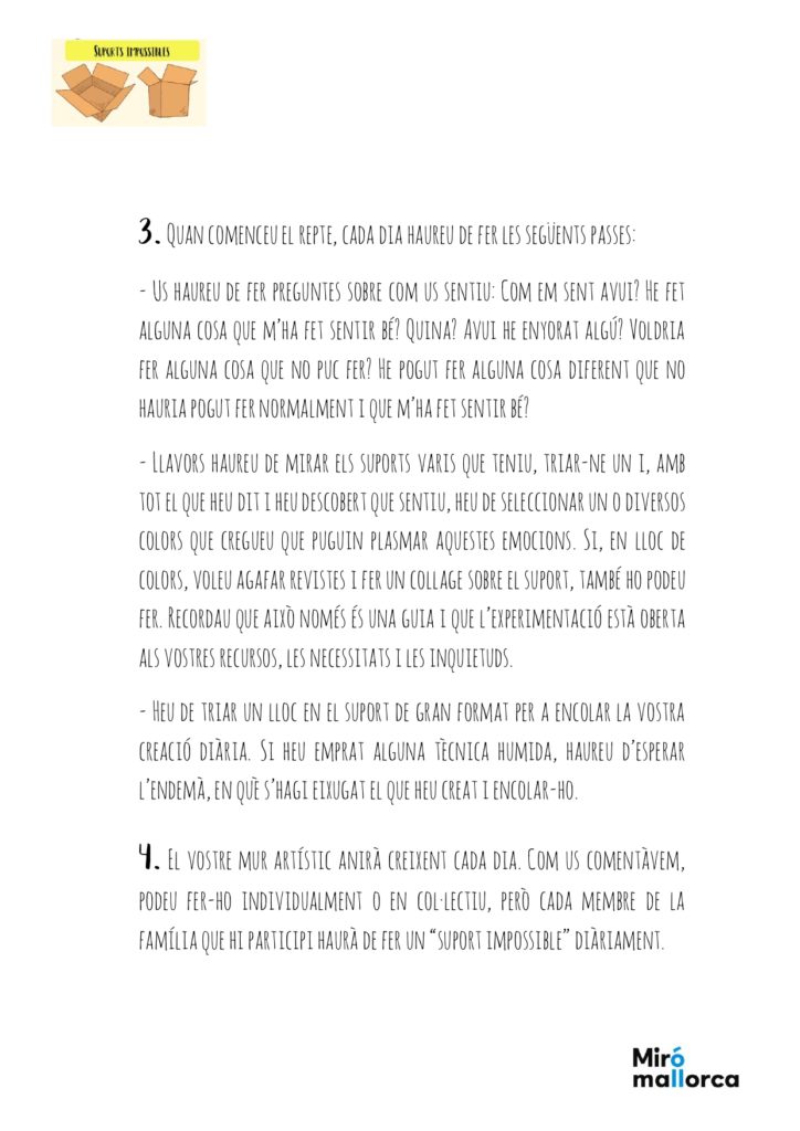 En trobareu la proposta desenvolupada al dossier pedagògic, i com sempre us animam a compartir-ne els vostres resultats o el procés a la nostra adreça electrònica, educacio@miromallorca.com, o en xarxes amb el hashtag #Miróenfamília.