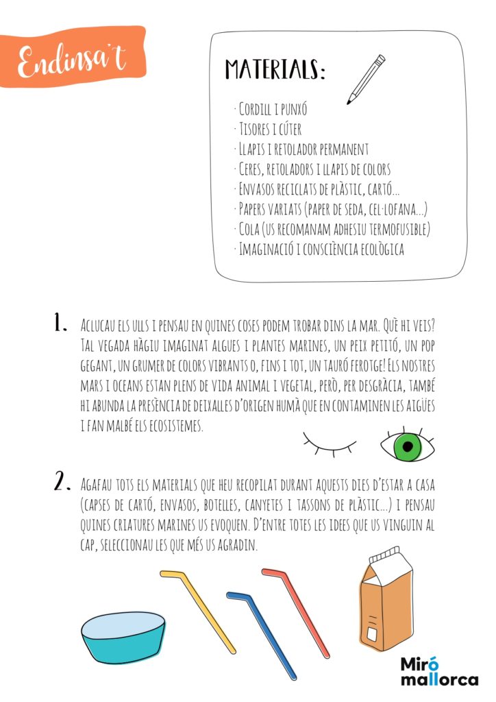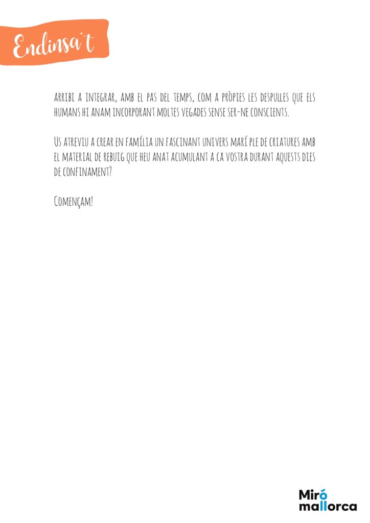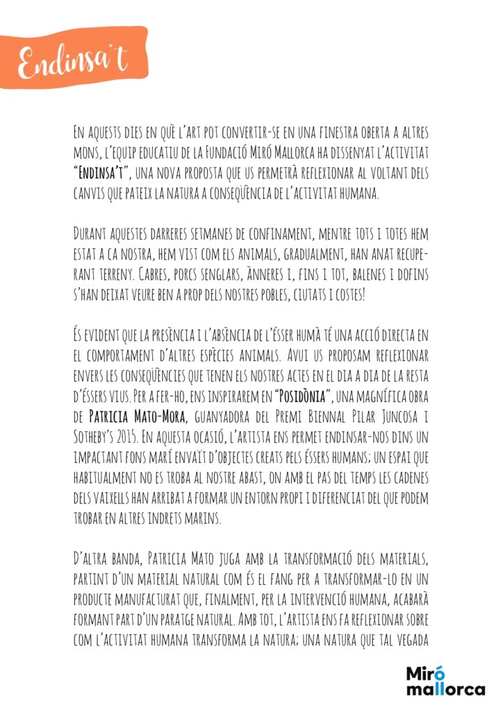L’activitat que us proposam avui està inspirada en “Endinsa’t”, un taller dissenyat per l’equip educatiu de la Fundació Miró Mallorca que s’emmarca dins els Mons Creatius de Primavera de 2017. L’eix vertebrador d’aquest projecte és la reflexió al voltant dels canvis que pateix la natura a conseqüència de l’activitat humana.