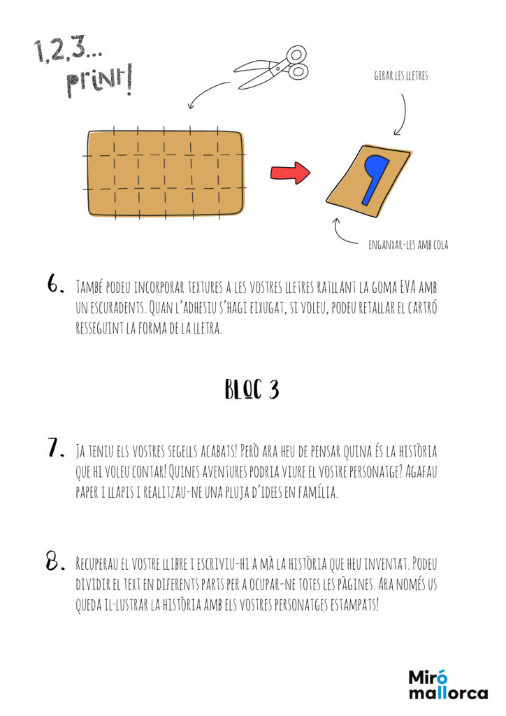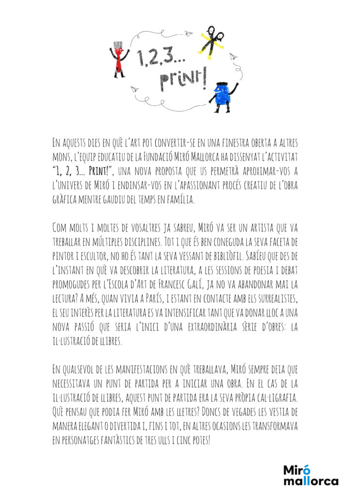 L’activitat que us proposam avui està inspirada en “1, 2, 3... Print!”, un taller dissenyat per l’equip educatiu de la Fundació Miró Mallorca que s’emmarca dins els Mons Creatius de Primavera de 2017. El fil conductor d’aquest projecte és la simbiosi de dos elements recurrents en l’obra de Joan Miró: l’obra gràfica i la tipografia.