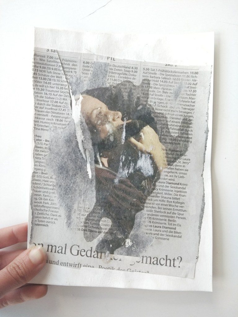 8 – Pots sobreposar altres notícies, imatges i papers de color a través del transfer i després intervenir amb pintura o amb el que et suggereixi la teva creativitat.