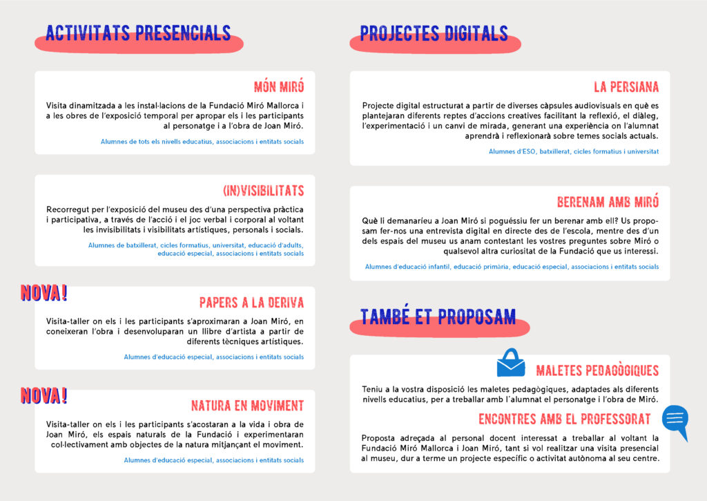 Per a més informació podeu contactar amb el Departament d’Educació i Activitats al telèfon 971 701 420 o a través de l’adreça electrònica educacio@miromallorca.com