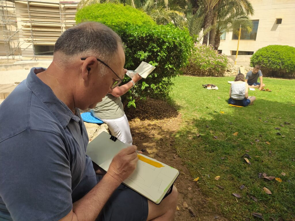 Aprofitant el bon temps, els vàrem proposar dur a terme un itinerari d’Urban Sketching pels espais exteriors de la Fundació amb l’objectiu de realitzar uns exercicis de dibuix al natural a partir de l’observació directa del paisatge, dels elements escultòrics i arquitectònics més emblemàtics del museu, intentant captar amb rapidesa els pensaments, les línies i els colors que els cridassin més l’atenció per a plasmar-ho tot seguit damunt els seus sketchbooks.