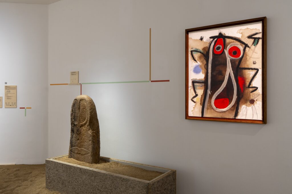 As part of this institutional collaboration, Fundació Miró Mallorca has loaned a remarkable collection of works by Joan Miró, which are fundamental to understanding the relationship between primitive symbolic language and the master’s artistic research during the middle decades of the 20th century. The selection, which combines painting, works on paper and pieces linked to traditional material culture, highlights the dialogue that Miró established with archaic forms, elemental signs and ritual imagery.