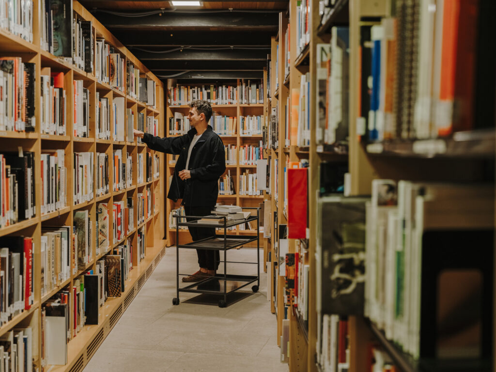 La biblioteca se encuentra en la Fundació Miró Mallorca, se ubica en la planta -1 del Edificio Moneo.