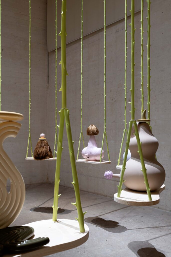 Grip Face se inspira en noticias de bombardeos en parques infantiles en lugares como Gaza o Ucrania, y utiliza el columpio como elemento simbólico para subrayar la fragilidad de la infancia en tiempos de guerra. Estos columpios, inmóviles y colgados de espinas, convierten el espacio en un escenario inquietante, donde la teatralidad se convierte en metáfora del campo de batalla y donde la quietud comunica una tensión latente.