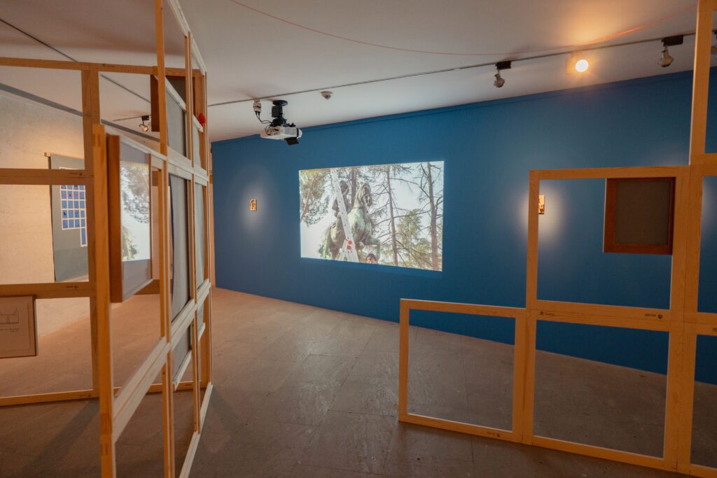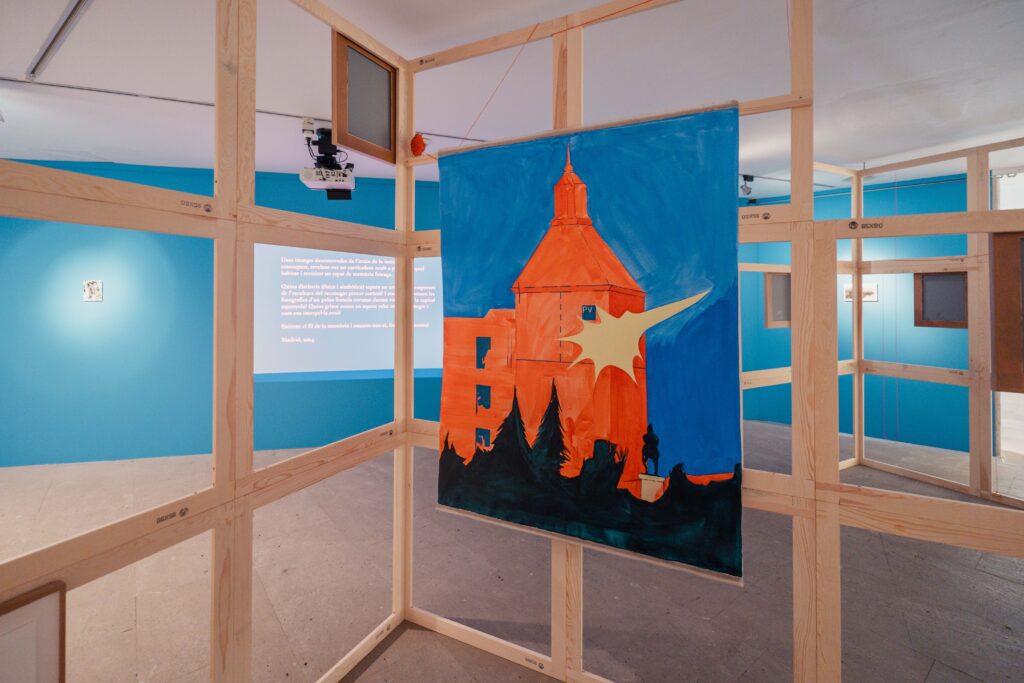 A la sala, s’erigeix una laberíntica construcció formada per bastidors en forma de les inicials CV. Com si fos un palau de la memòria, la instal·lació actua com un instrument mnemotècnic mental amb forma d’arquitectura fictícia, on dipositar allò que volem recordar. Traslladat a la sala expositiva, aquest palau de la memòria, amb les seves pintures de grans dimensions, els dibuixos i les fotografies d’arxiu, esdevé un dispositiu que ens permet recórrer els espais que perviuen en el present, alhora que ens convida a transitar la distància que ens separa del passat. Travessant les seves estances, les realitats temporals s’encavalquen i podem visualitzar els fets sobre els quals l’arquitectura ja no ens parla.