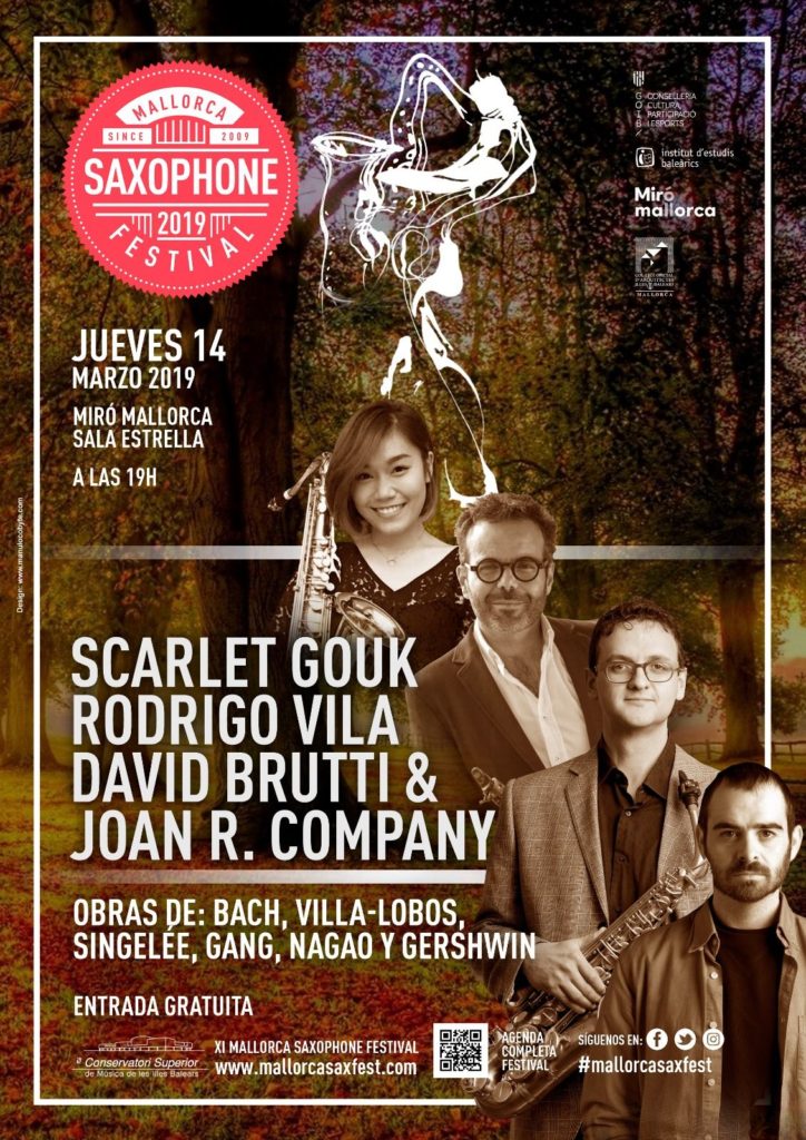 El proper dijous, 14 de març a les 19 hores, tindrà lloc el tercer concert del XI Mallorca Saxophone Festival amb l’actuació de Scarlet Gouk, Rodrigo Vila, David Brutti & Joan R. Company que interpretaran obres de Bach, Villa-Lobos, Singelée, Gang, Nagao y Gershwin.