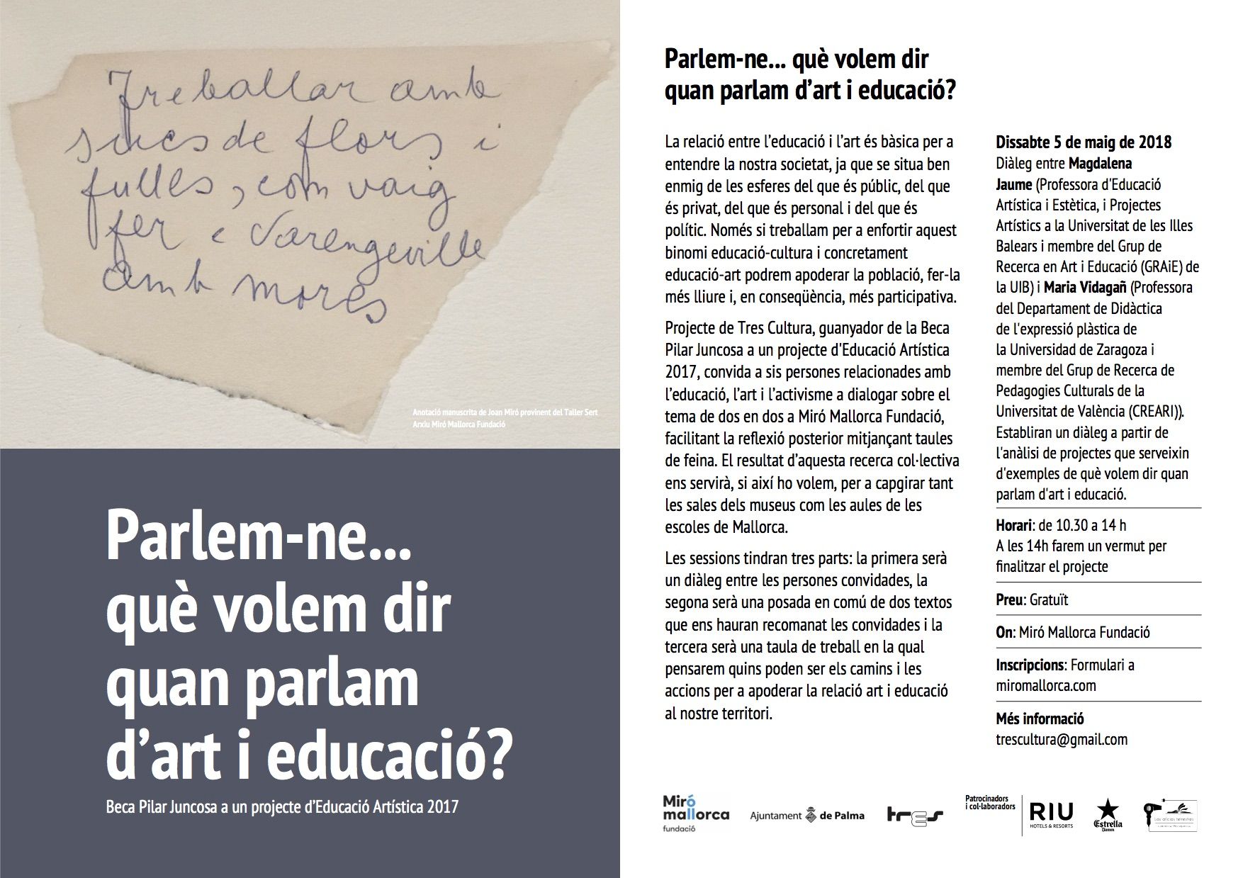 Projecte de Tres Cultura, guanyador de la Beca Pilar Juncosa a un projecte d'educació artística 2017, en què sis referents que actualment estan repensant les relacions entre art i educació dialogaran sobre el tema de dos en dos a la Fundació Miró Mallorca, facilitant la reflexió posterior mitjançant taules de feina. El resultat serà un poderós think tank que ens servirà per a capgirar tant les sales dels museus com les aules de les escoles de Mallorca.