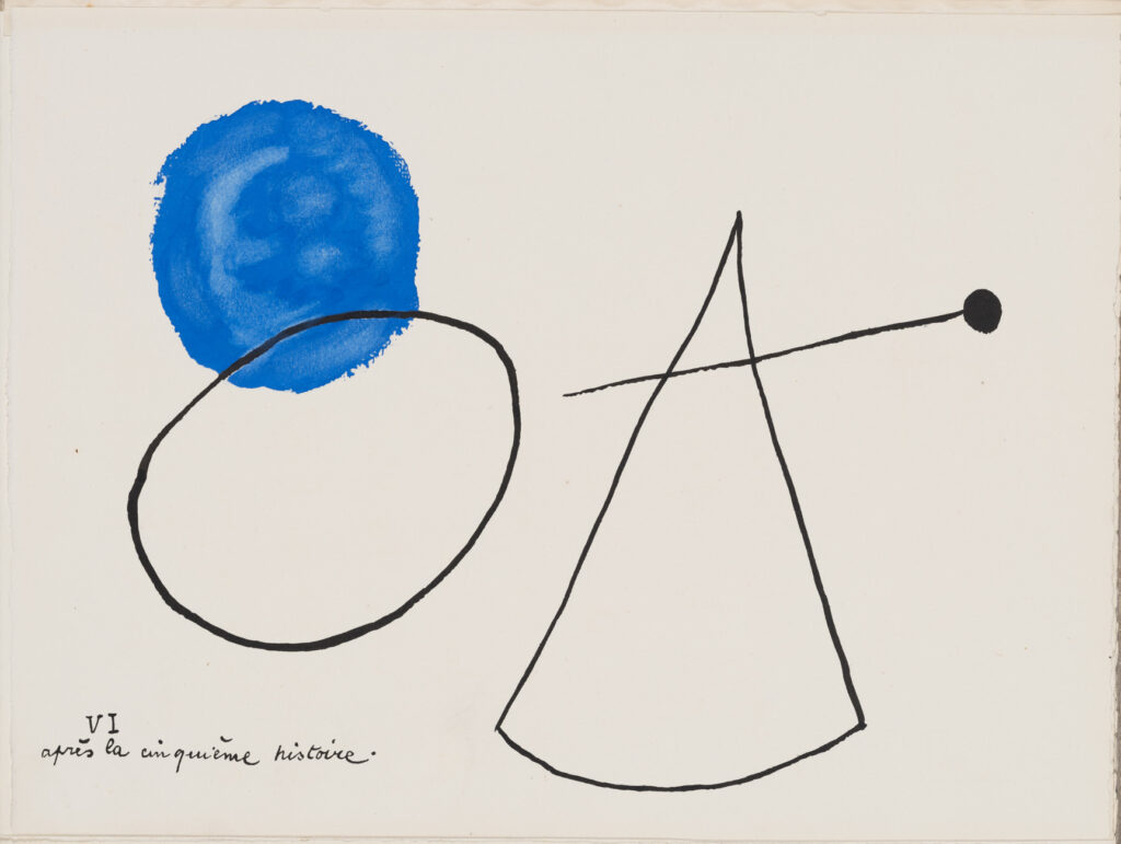 Calder iniciaba en esos años su fascinación por las constelaciones y las reglas estrictas que rigen unos movimientos celestes aparentemente aleatorios, tal como muestra el dibujo de nuestra colección fechado en 1932. Este interés daría lugar a la serie Constellations realizada en 1943 en Roxbury, Connecticut. Paradójicamente, Miró acababa de finalizar sus veintitrés Constel.lacions, serie iniciada en 1940 en Varengeville-sur-Mer, donde de nuevo coincidió con Calder, y finalizada en 1941, entre Mallorca y Mont-roig. Presentamos aquí una selección de Constelaciones extraídas del libro de artista publicado por André Breton en 1959 con reproducciones en pochoir de los gouaches originales de Miró.