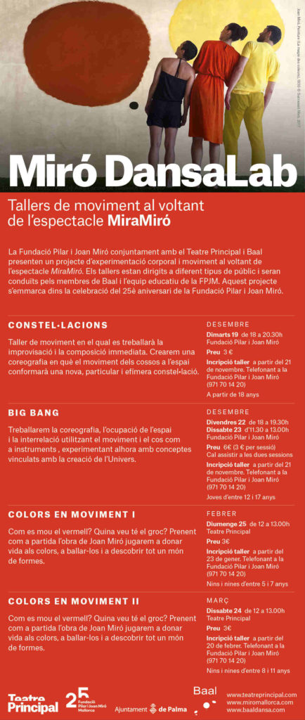 La Fundació Miró Mallorca, conjuntamente con el Teatro Principal y la compañía de danza Baal, presentamos un proyecto de experimentación corporal y movimiento con MiraMiró como punto de partida, un espectáculo de danza y animación de vídeo que nace del universo de Joan Miró.
