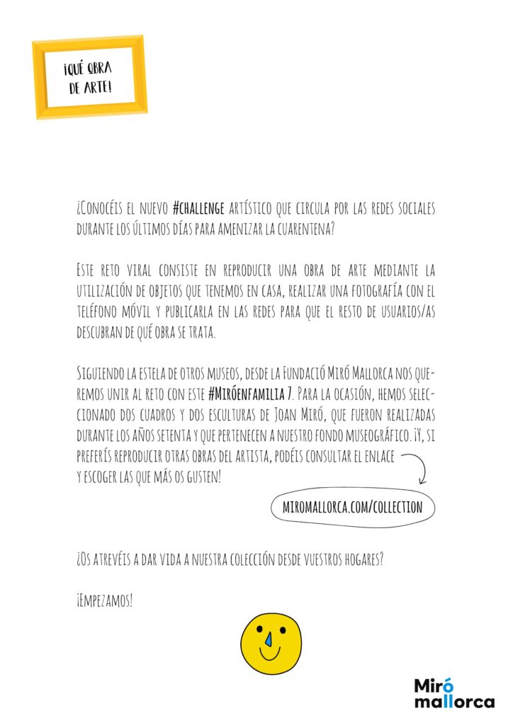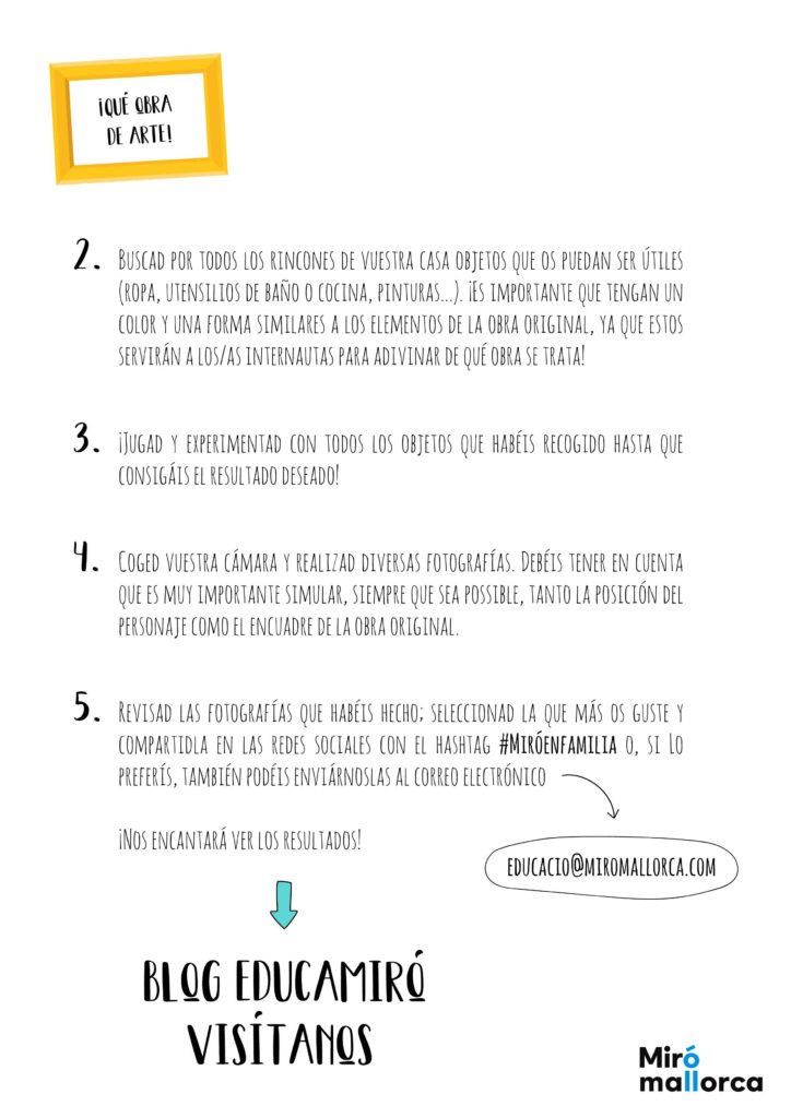 No os olvidéis de compartir las fotografías de vuestras creaciones en las redes sociales con el hashtag #Miróenfamilia o, si lo preferís, también podéis enviárnoslas al correo electrónico educacio@miromallorca.com