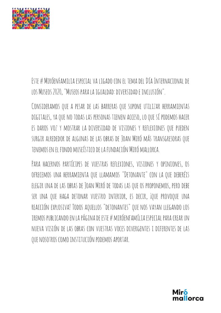 Este nuevo #Miróenfamília Especial va ligado al tema del Día Internacional de los Museos 2020, "Museos para la igualdad: diversidad e inclusión", con una propuesta que quiere daros voz a vosotros y que parte de la observación y reflexión alrededor de algunas de las obras más transgresoras de Joan Miró.