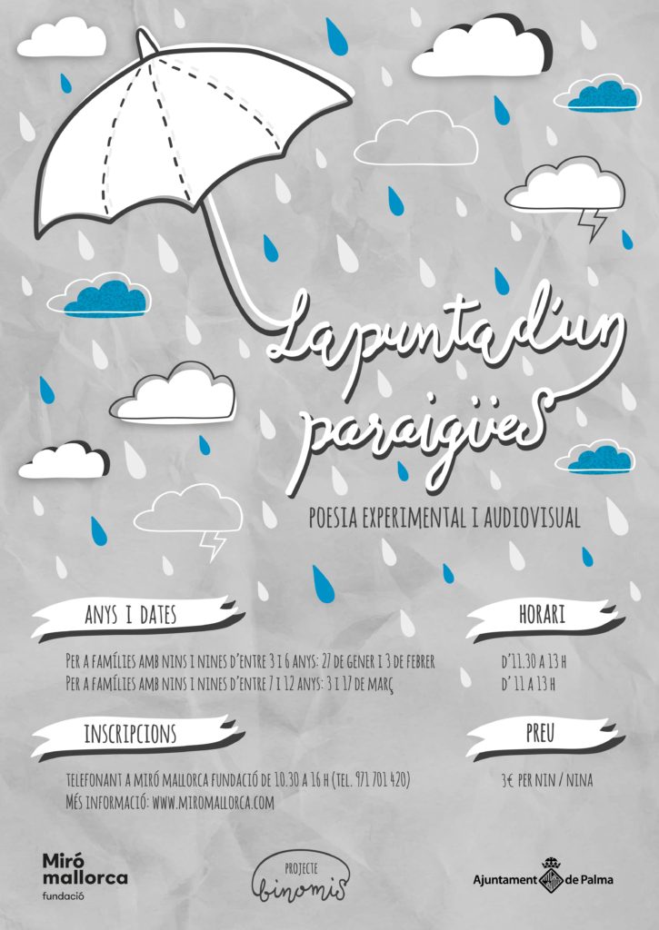 “La punta d’un paraigües” és un taller dirigit a famílies amb nins i nines d’entre 3 i 12 anys en què ens convertirem en exploradors de paraules, qüestionant-nos el museu i tot el món de Joan Miró que ens envolta a través del binomi de la poesia experimental i els mitjans audiovisuals.