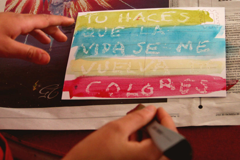 El punt de partida del nostre taller ha estat el 90è aniversari de les noces entre Pilar Juncosa i Joan Miró que es celebrarà el proper mes d’octubre. Hem vist i comentat les dedicatòries que es van escriure aquell dia tan especial i ens hem fet preguntes com: “Què és l’amor? Què vol dir estimar? Què ens agrada fer amb les persones que estimem?” Amb aquestes qüestions hem reflexionat sobre com ens agrada compartir el temps amb aquelles persones que són importants per nosaltres i ho hem representat en una postal.
