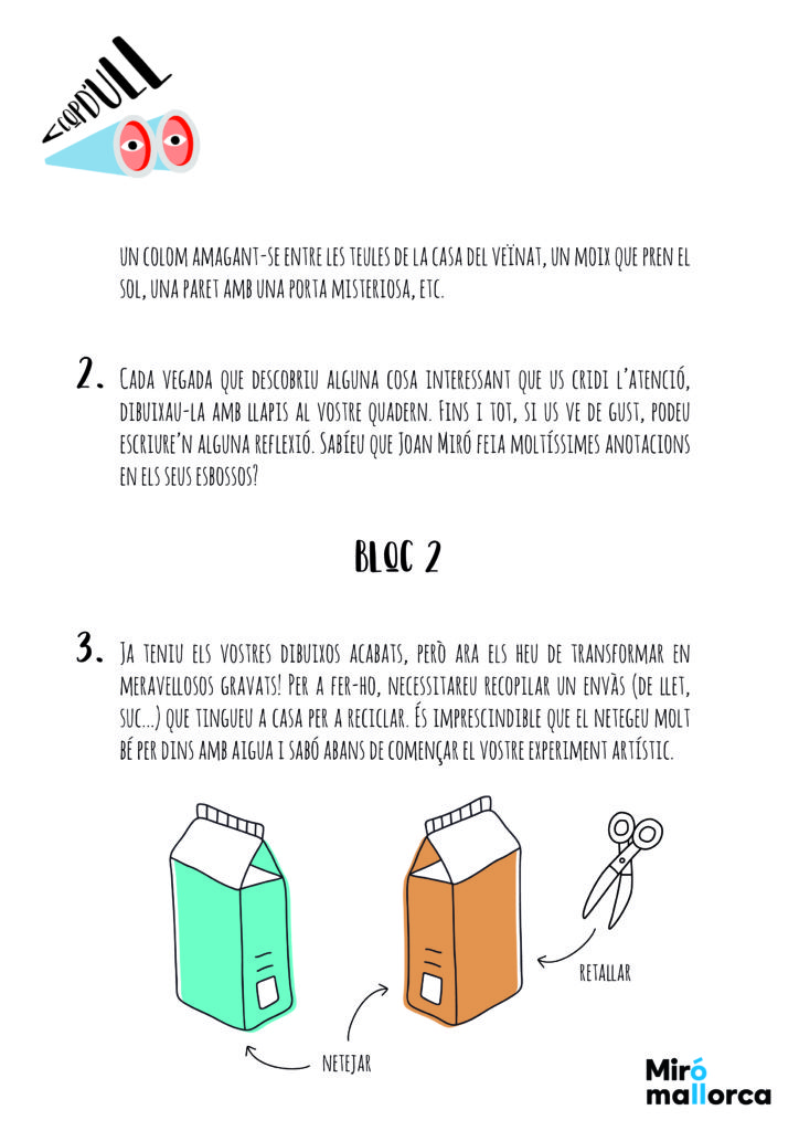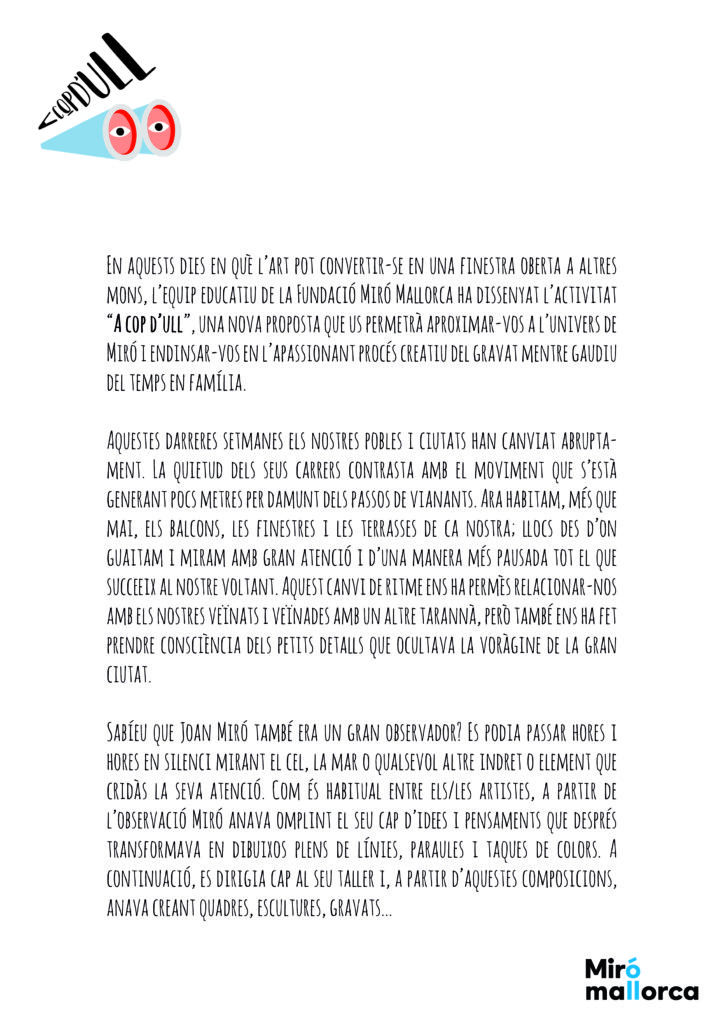 En aquests dies d’incertesa en què l’art pot convertir-se en una finestra oberta a altres mons, l’equip educatiu de la Fundació Miró Mallorca ha dissenyat l’activitat “A cop d’ull”, una nova proposta que us permetrà aproximar-vos a l’univers de Miró i endinsar-vos en l’apassionant procés creatiu del gravat mentre gaudiu del temps en família.