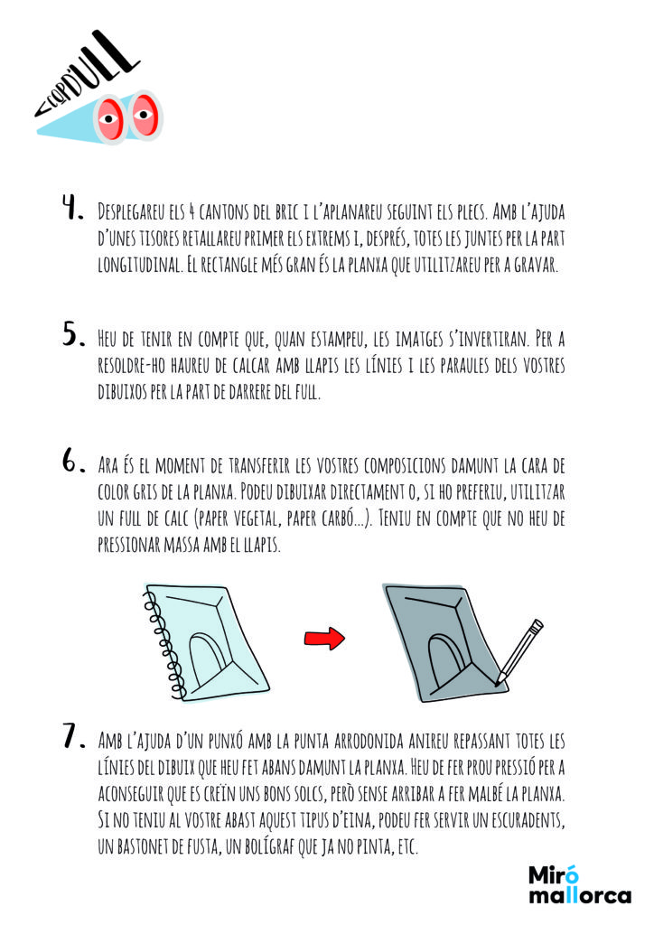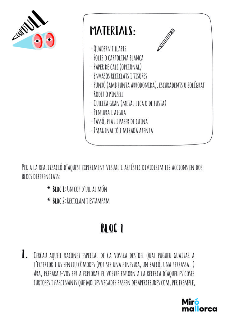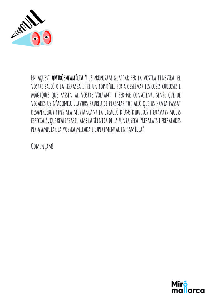 En aquest #Miróenfamília 9 us proposam guaitar per la vostra finestra, el vostre balcó o la terrassa i fer un cop d’ull per a observar les coses curioses i màgiques que passen al vostre voltant, i ser-ne conscients, sense que de vegades us n’adoneu. Llavors haureu de plasmar tot allò que us havia passat desapercebut fins ara mitjançant la creació d’uns dibuixos i gravats molts especials, que realitzareu amb la tècnica de la punta seca. Preparats i preparades per a ampliar la vostra mirada i experimentar en família? Doncs no us podeu perdre la guia pedagògica A cop d’ull, on trobareu tot el material necessari i totes les passes a seguir per a endinsar-vos en l’apassionant procés creatiu de l’obra gràfica.