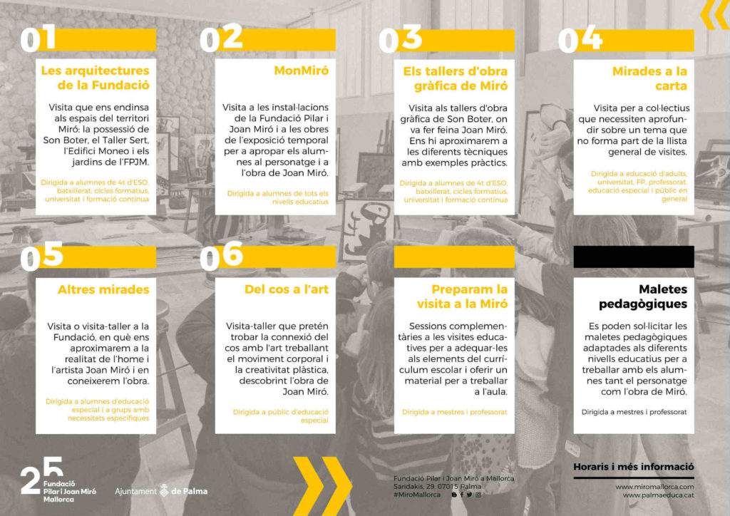 Podeu reservar mitjançant el web Palma Educa o bé contactant directament amb el Departament d’Educació i Activitats al telèfon 971 701 420 o al correu electrònic educacio@miromallorca.com.