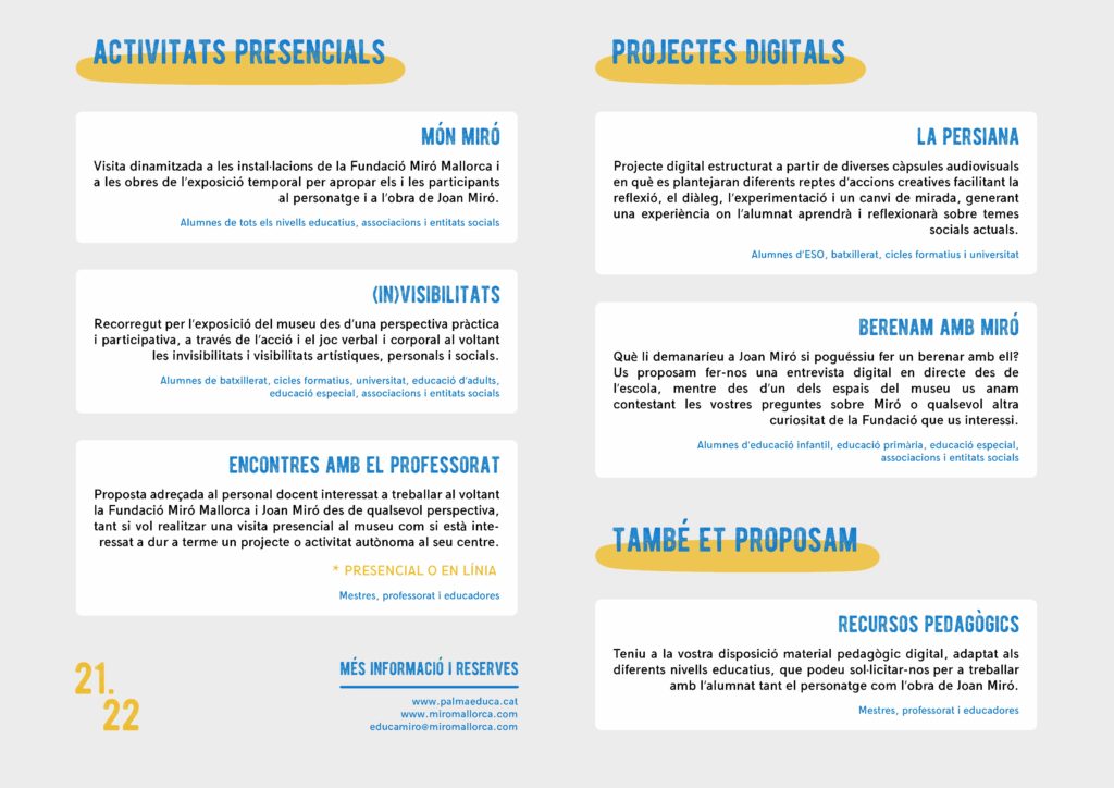Des del Departament d’Educació i Activitats de la Fundació Miró Mallorca us presentam el nostre nou Programa per a centres educatius i socials per al curs 2021-2022.