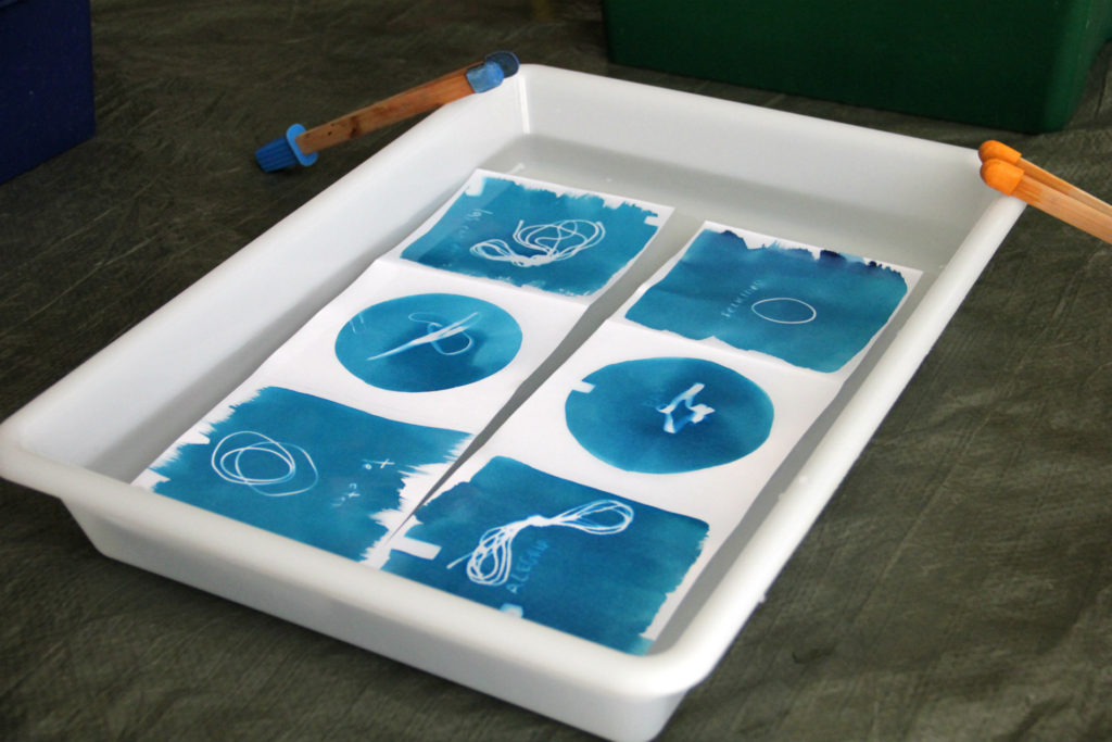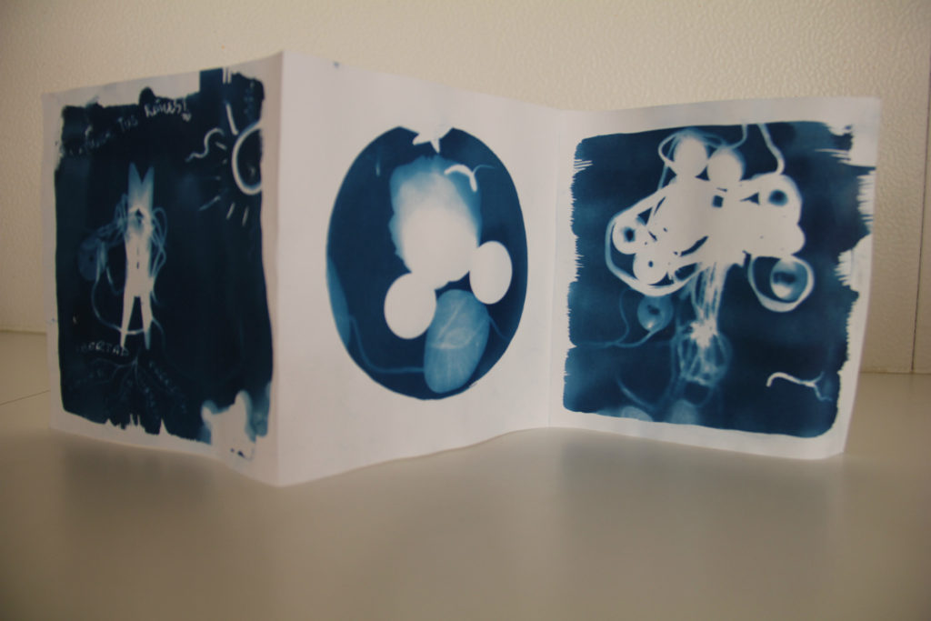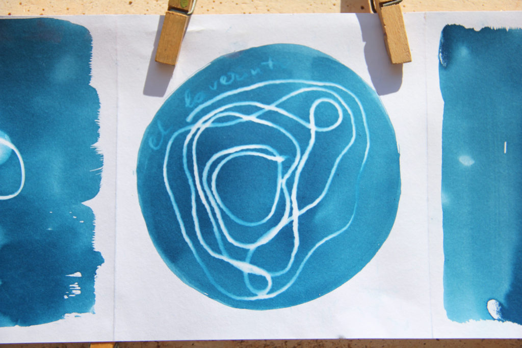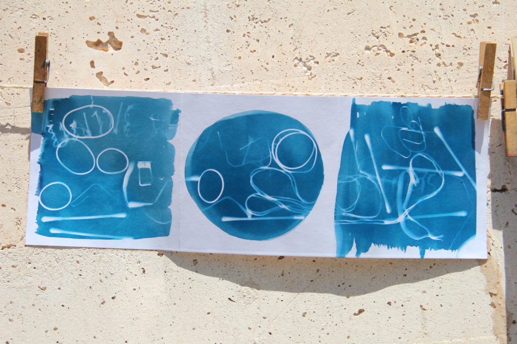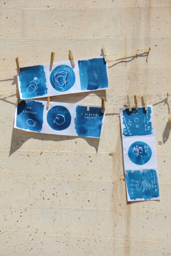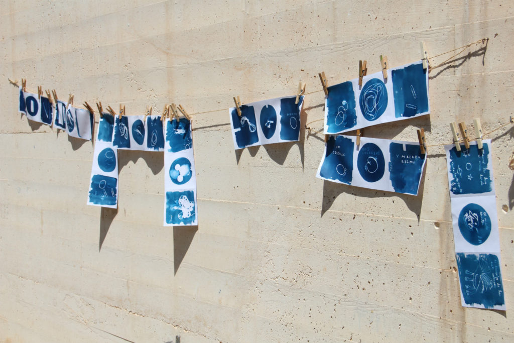 Seguidament ens hem dirigit cap a l’Espai Educatiu per a crear el nostre propi llibre d’artista a partir de l’experimentació amb la cianotípia. Aquest meravellós procediment fotogràfic ens ha permès elaborar, a partir d’objectes quotidians i l’anàlisi del poema Le lézard aux plomes d’ór, il·lustrat per Miró l’any 1971, unes suggerents peces que evoquen el procés creatiu de l’artista català.