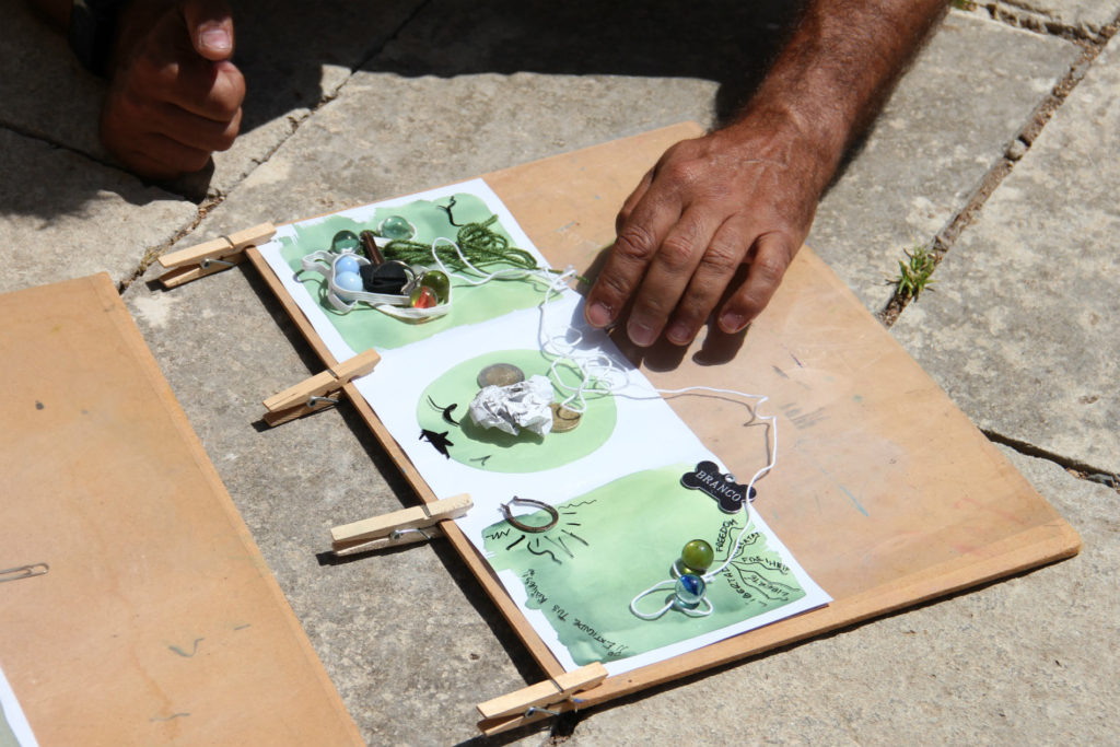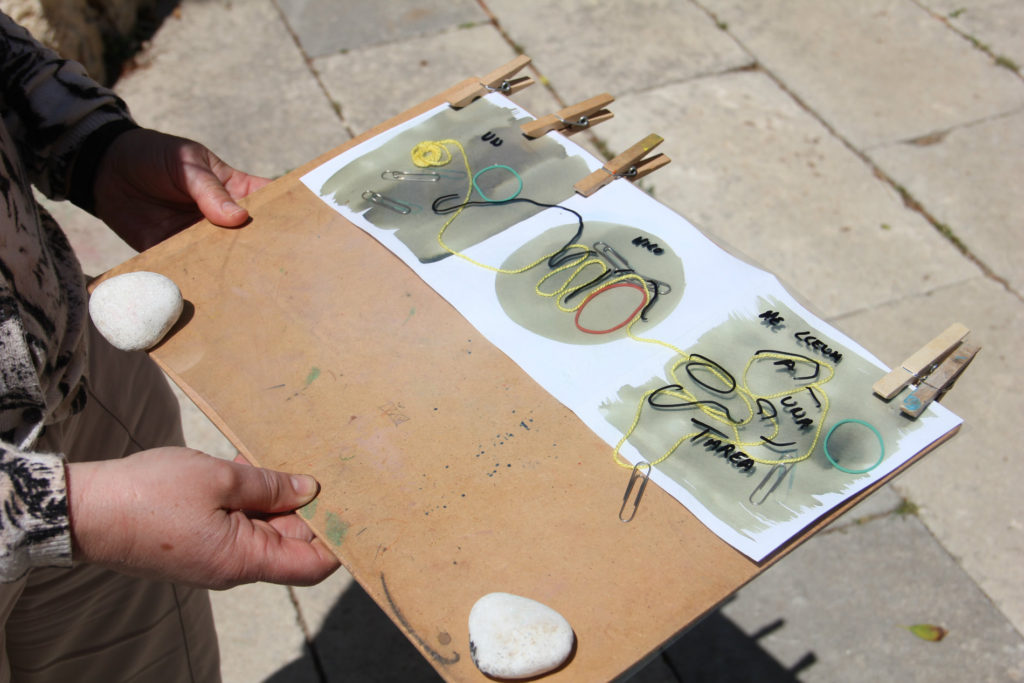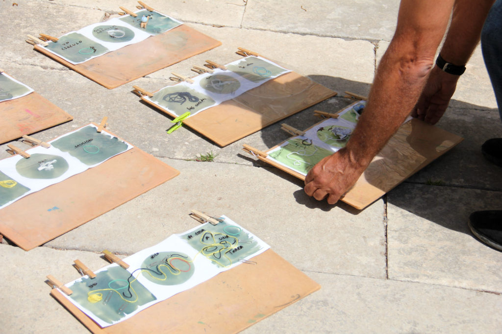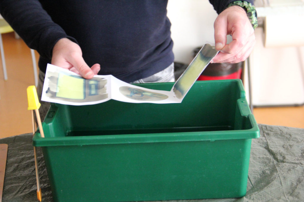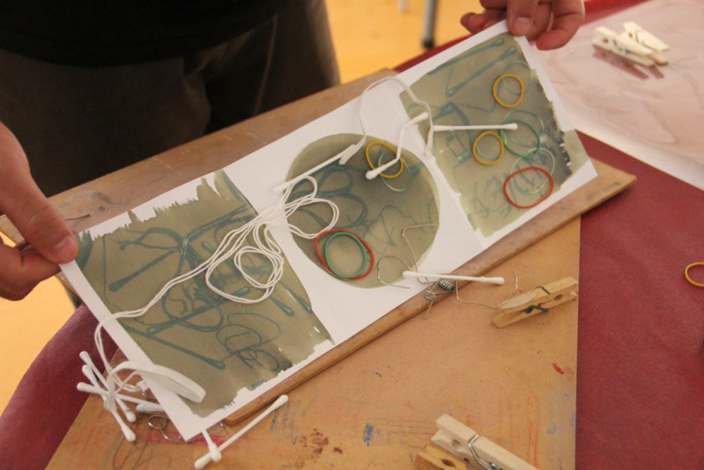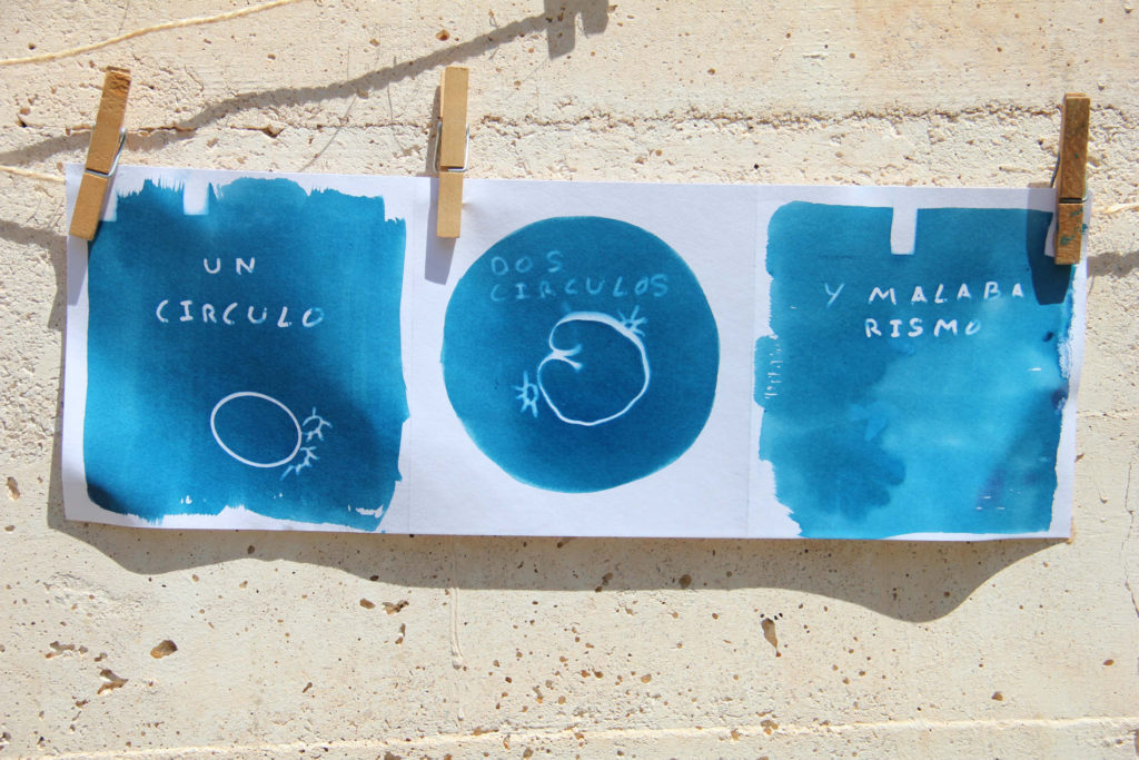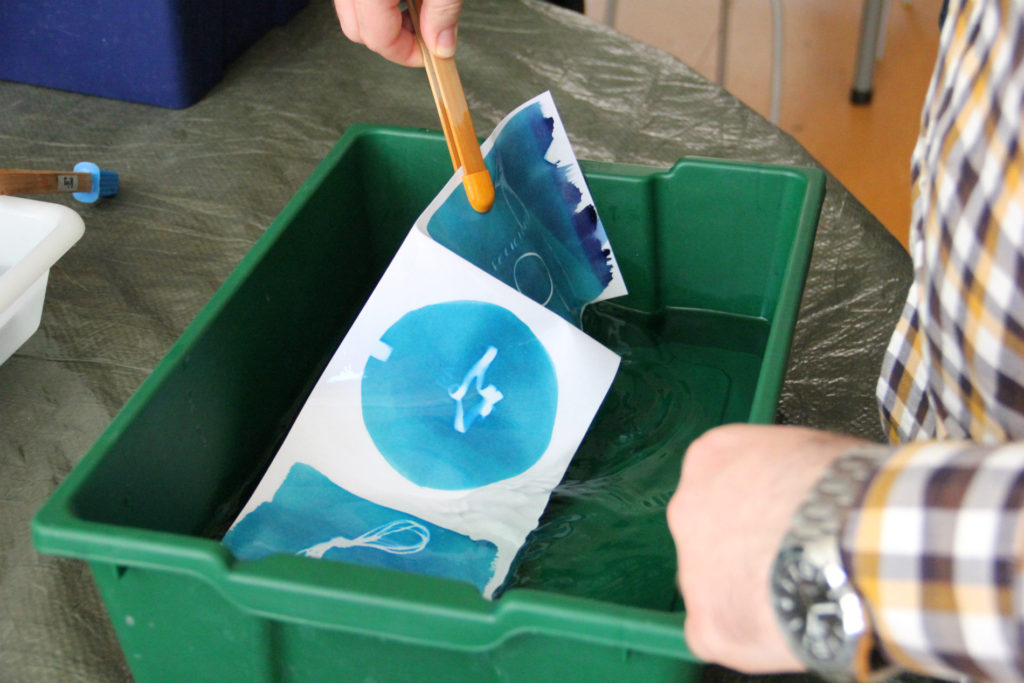 Seguidament ens hem dirigit cap a l’Espai Educatiu per a crear el nostre propi llibre d’artista a partir de l’experimentació amb la cianotípia. Aquest meravellós procediment fotogràfic ens ha permès elaborar, a partir d’objectes quotidians i l’anàlisi del poema Le lézard aux plomes d’ór, il·lustrat per Miró l’any 1971, unes suggerents peces que evoquen el procés creatiu de l’artista català.